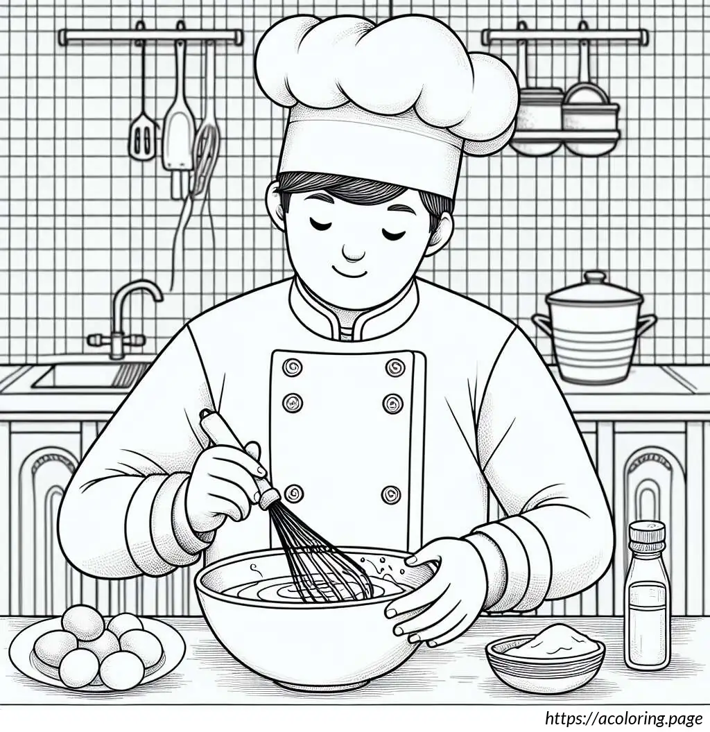 The background indicates a kitchen setting, with tiles lining the wall. In the immediate vicinity of the chef, there are various cooking ingredients and utensils visible. These include a bowl possibly containing flour, a bottle likely for oil or vinegar, and a few eggs resting near the bowl. The overall style is simplistic, emphasizing outlines without any shading or color, giving it a clean and accessible appearance typical of coloring book illustrations.