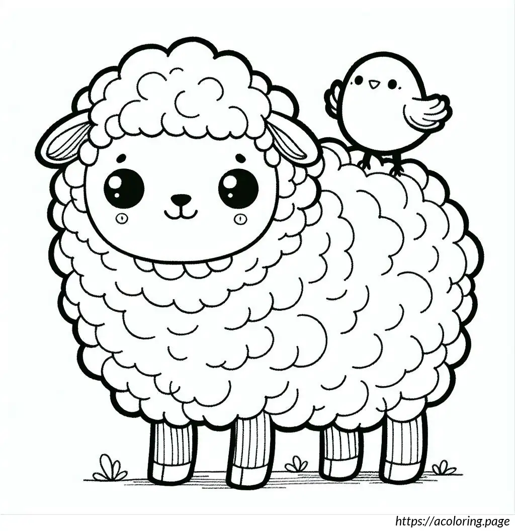 The image depicts a cute and simple line drawing, suitable for a coloring book, featuring a sheep and a bird. The sheep, which is the larger figure, has a fluffy body with a distinct texture that resembles clouds or cotton. It has a friendly and gentle expression, with large eyes and a small smile. The sheep also has four thin legs and a small tail.